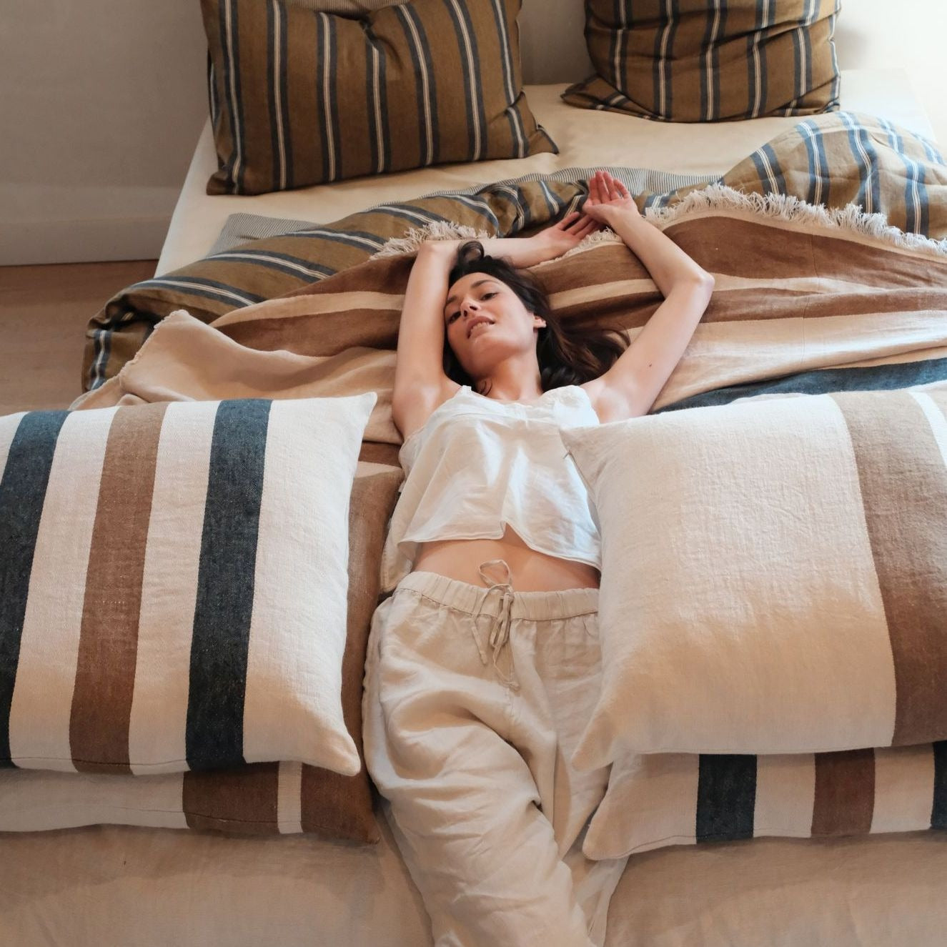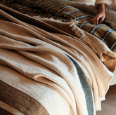 Geef je interieur een verfijnde en rustgevende uitstraling met de Julian linnen sierdeken! Deze 100% linnen deken met een gewassen afwerking voelt heerlijk zacht aan en heeft een lichte, nonchalante look. Het stijlvolle streeppatroon in warme zand-, grijsblauw- streeppatroon op een dusty off-white achtergrond geeft een tijdloze en natuurlijke touch die moeiteloos in elk interieur past.