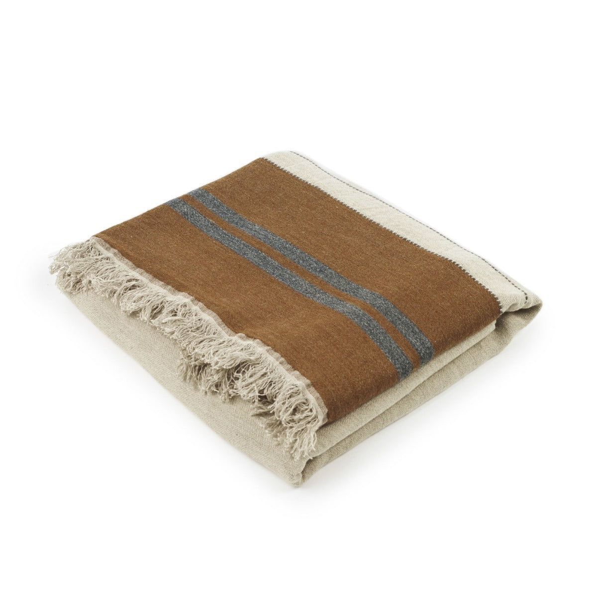 Breng warmte en karakter in je interieur met de Highland Stripe linnen-wollen sierdeken! Deze luxueuze plaid combineert linnen en wol voor een heerlijk zachte en rijke uitstraling. De gember-, leer- en rookkleurige strepen op een neutrale ondergrond zorgen voor een natuurlijke, tijdloze look. Uniek aan dit sierdeken is de subtiele naad in het midden en de afwerking met franjes, terwijl elk uiteinde een net iets ander streeppatroon heeft – een speels detail dat de plaid extra bijzonder maakt.